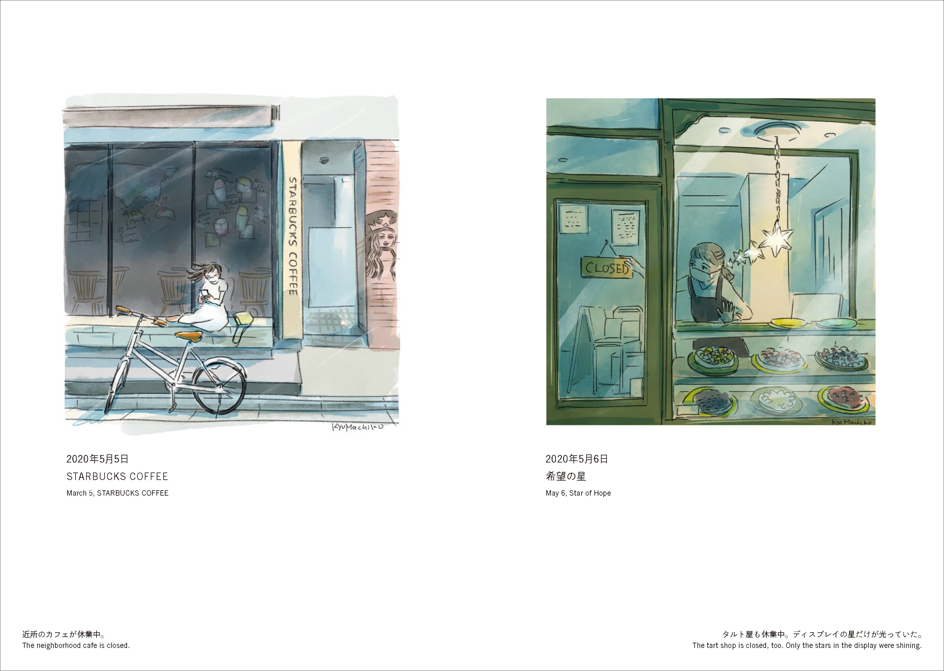 Since the declaration of the state of emergency in April 2020, Machiko Kyo has been carefully and quietly depicting the people and the city under the situation which social distance has become the norm. She has drawn from a perspective that gently accompanies those who are working hard.